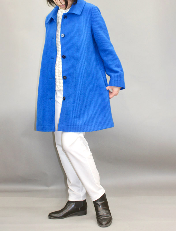 鮮やかなブルーのコートとホワイトカラーの組み合わせは、すっきりした透明感があり、上品な大人の着こなしに。