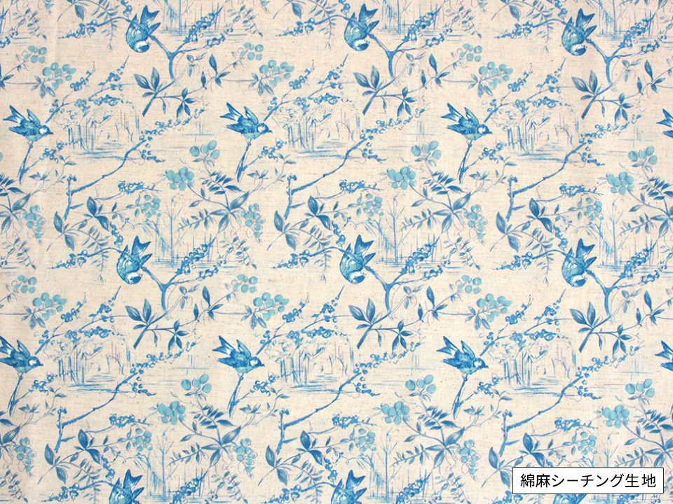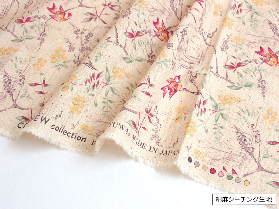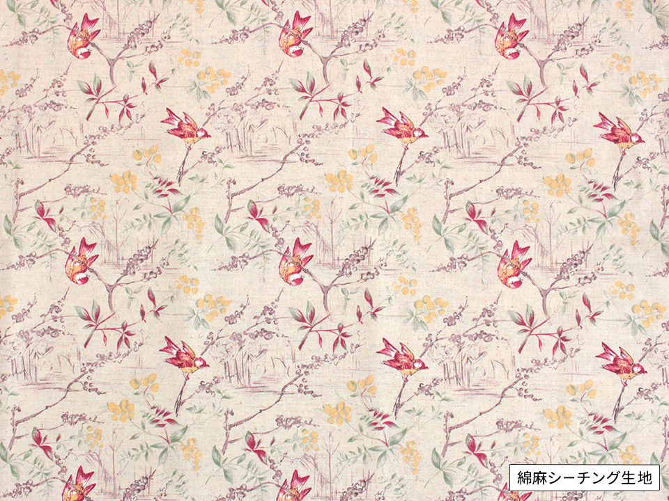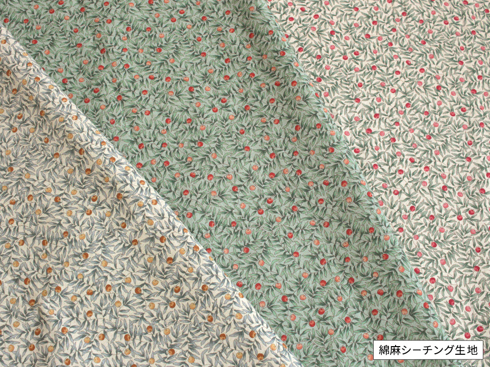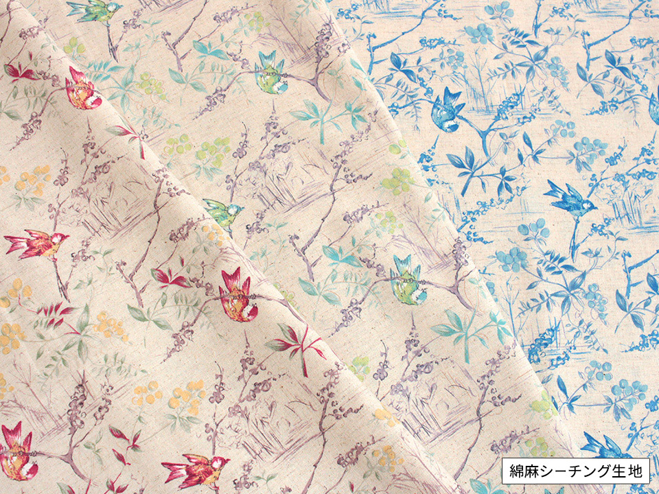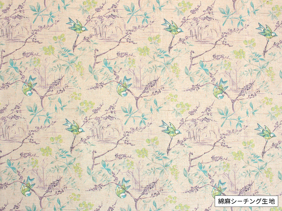 麻のナチュラルな風合いが魅力のシーチング生地は、アンティークな鳥柄と、上品な木の実柄をそれぞれ3色展開です。