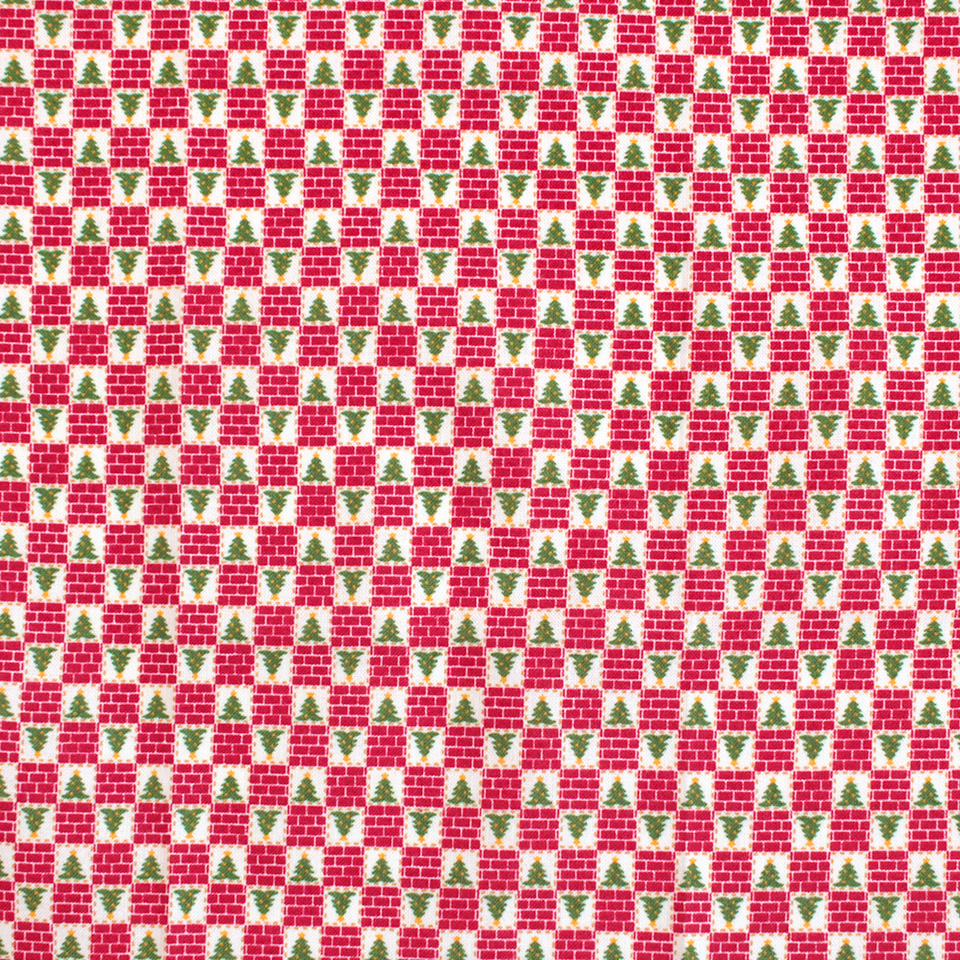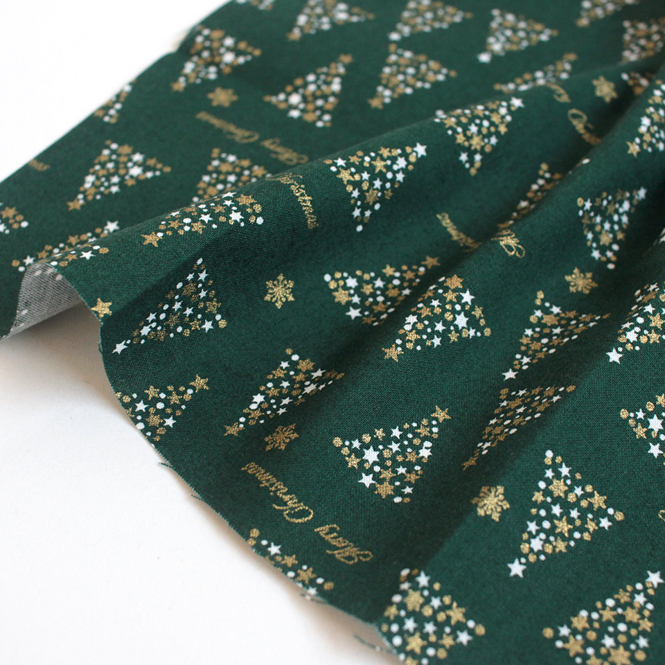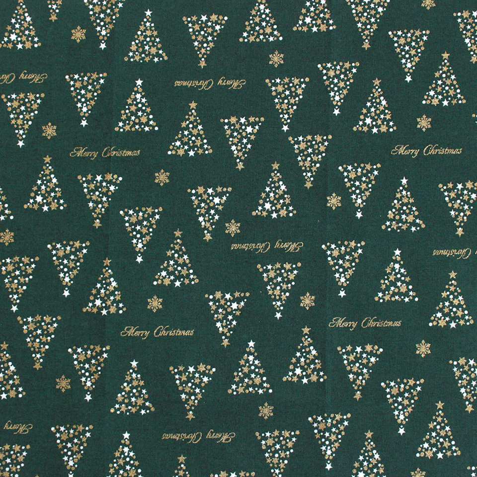ゴールドカラーがポイントのツリー柄、ツリーとレンガを組み合わせたパッチワーク柄はグリーンとレッドの2色展開。