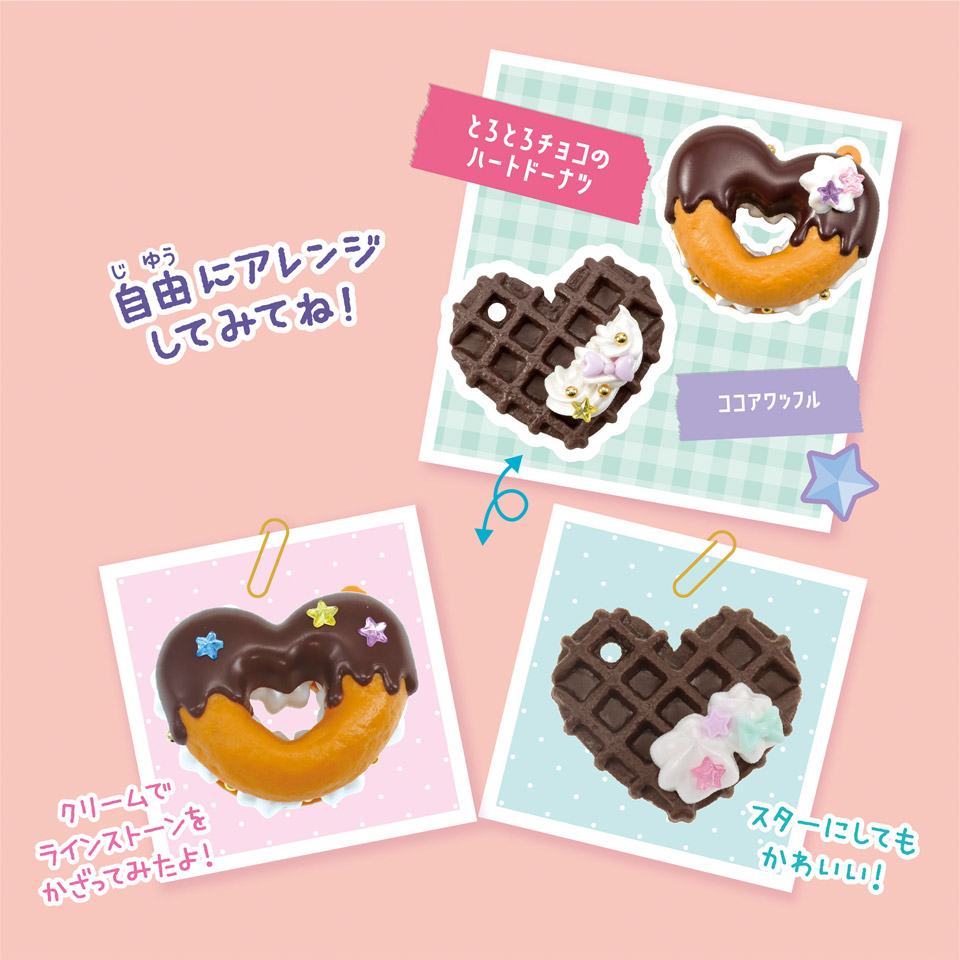 自由にクリームをしぼって、ドーナツ、ワッフル、ビスケットの3種類のスイーツ作品が作れるよ!