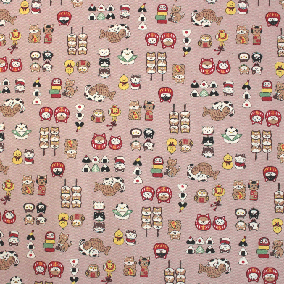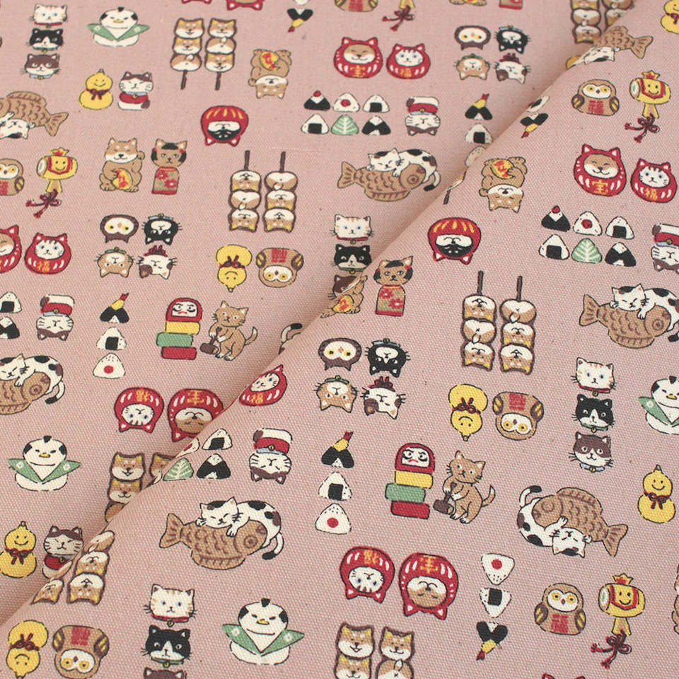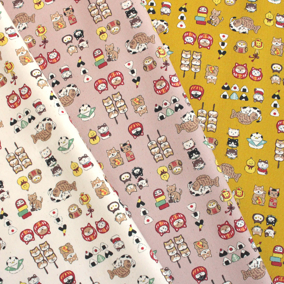 和のモチーフ×動物をミックスした遊び心いっぱいのプリント生地です。