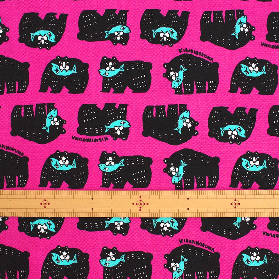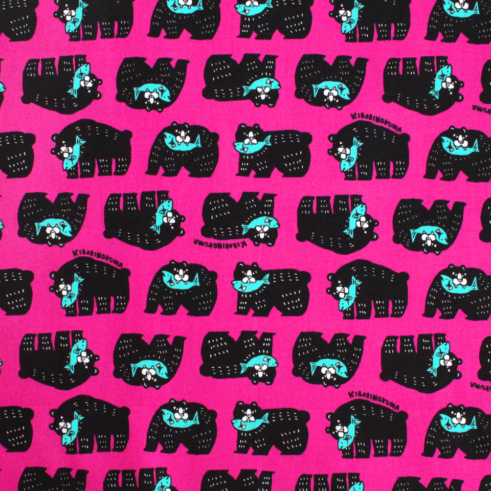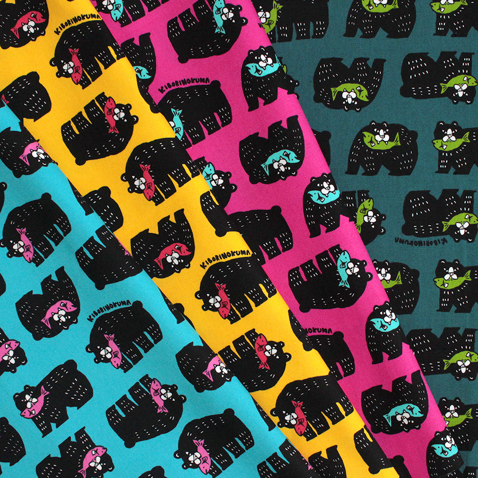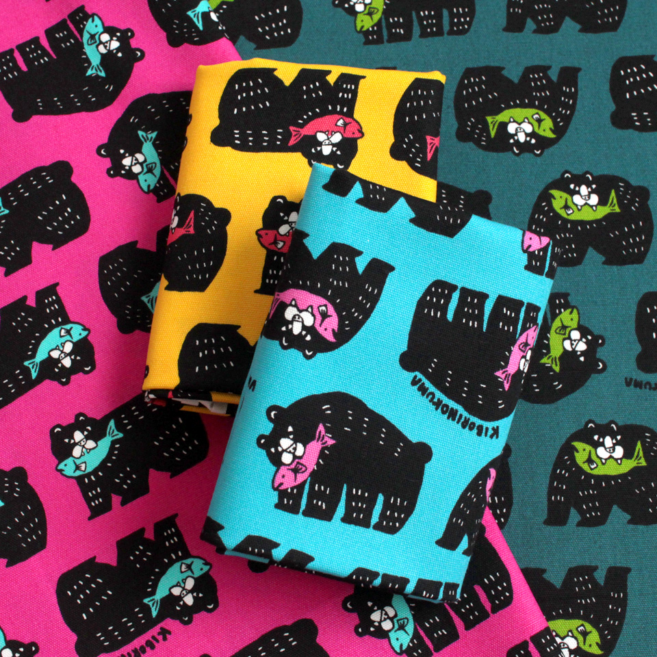 北海道を代表する民芸品「木彫りのクマ」をポップに描いたプリント生地です。
