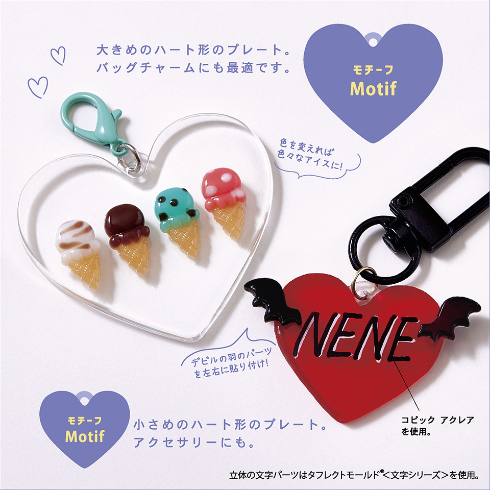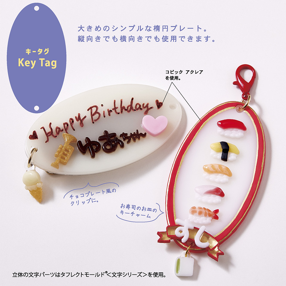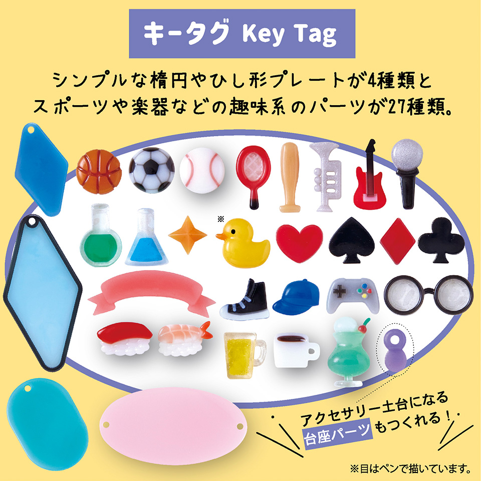 「キータグ」はスポーツや楽器などの趣味系、「モチーフ」は食べ物や花などのパーツが作れます。