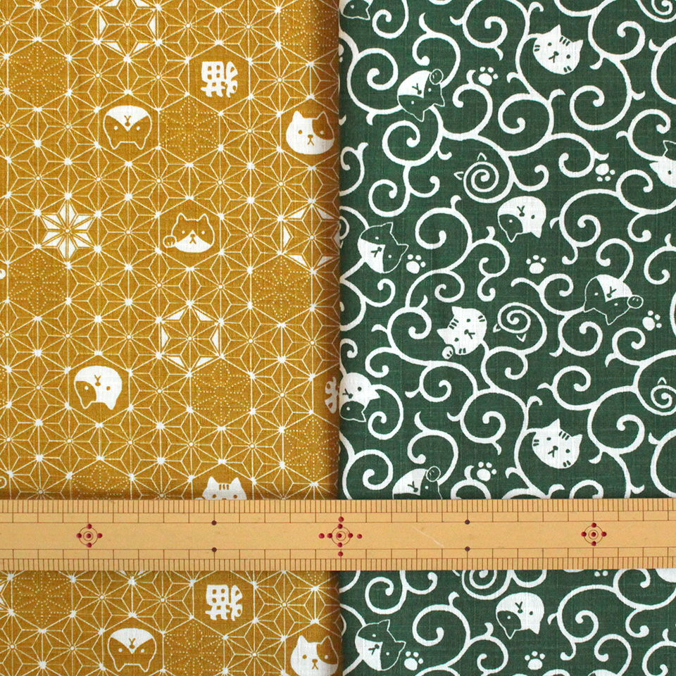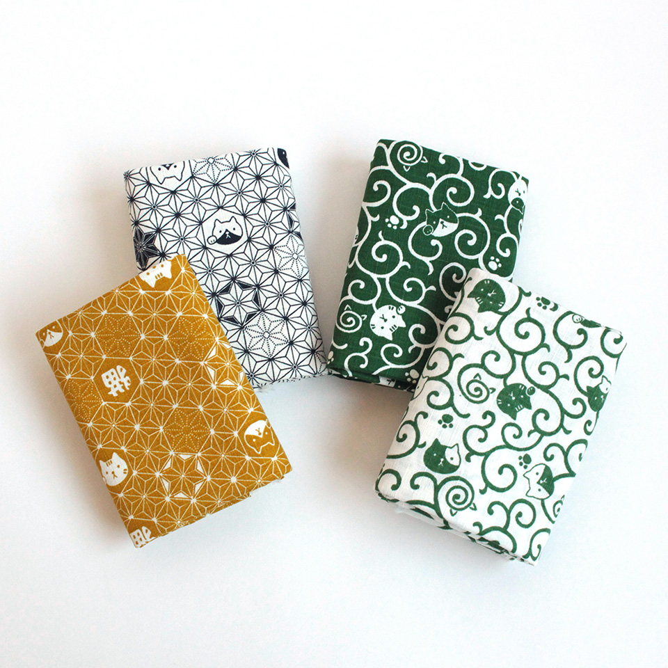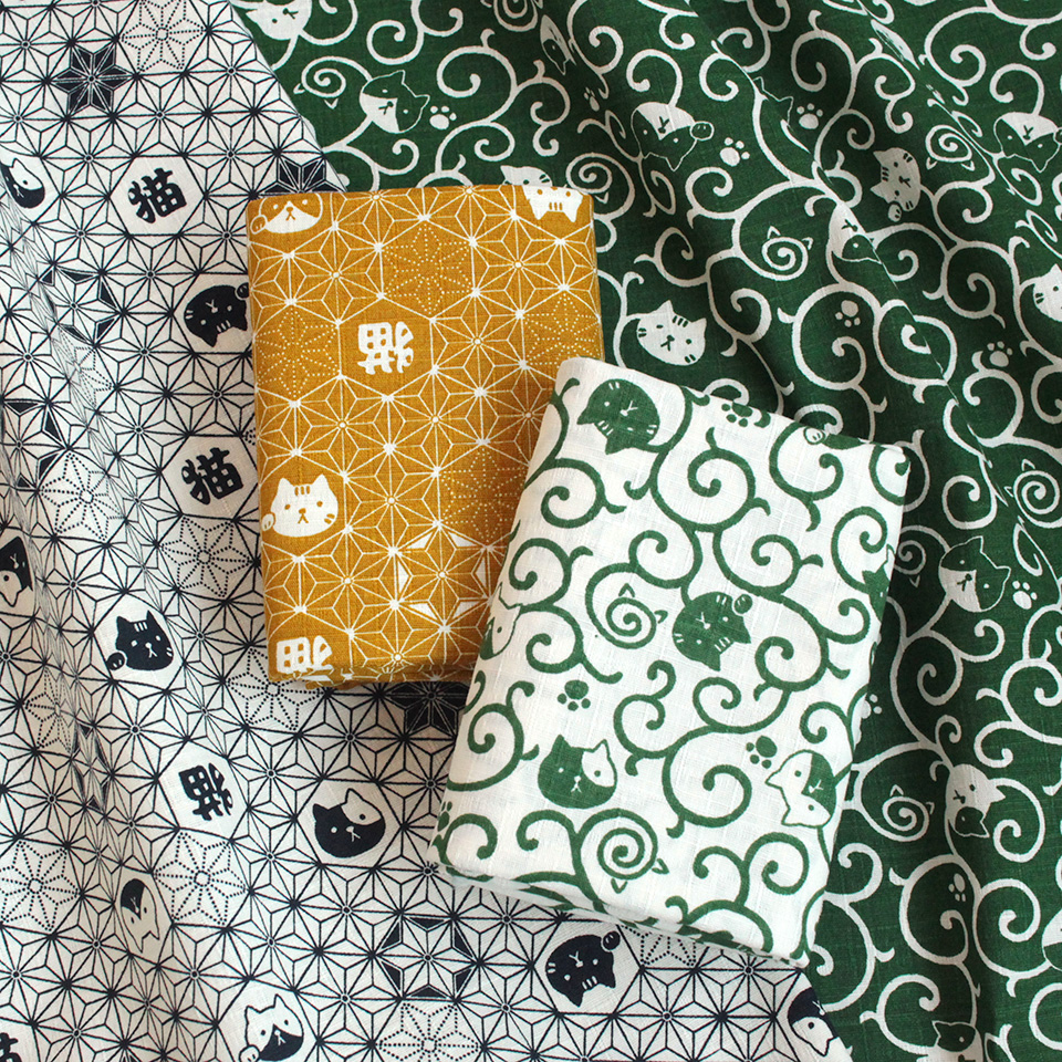 足跡と耳のカタチがこっそり隠れた唐草模様と、『猫』の漢字がアクセントになった麻の葉模様の2柄展開。