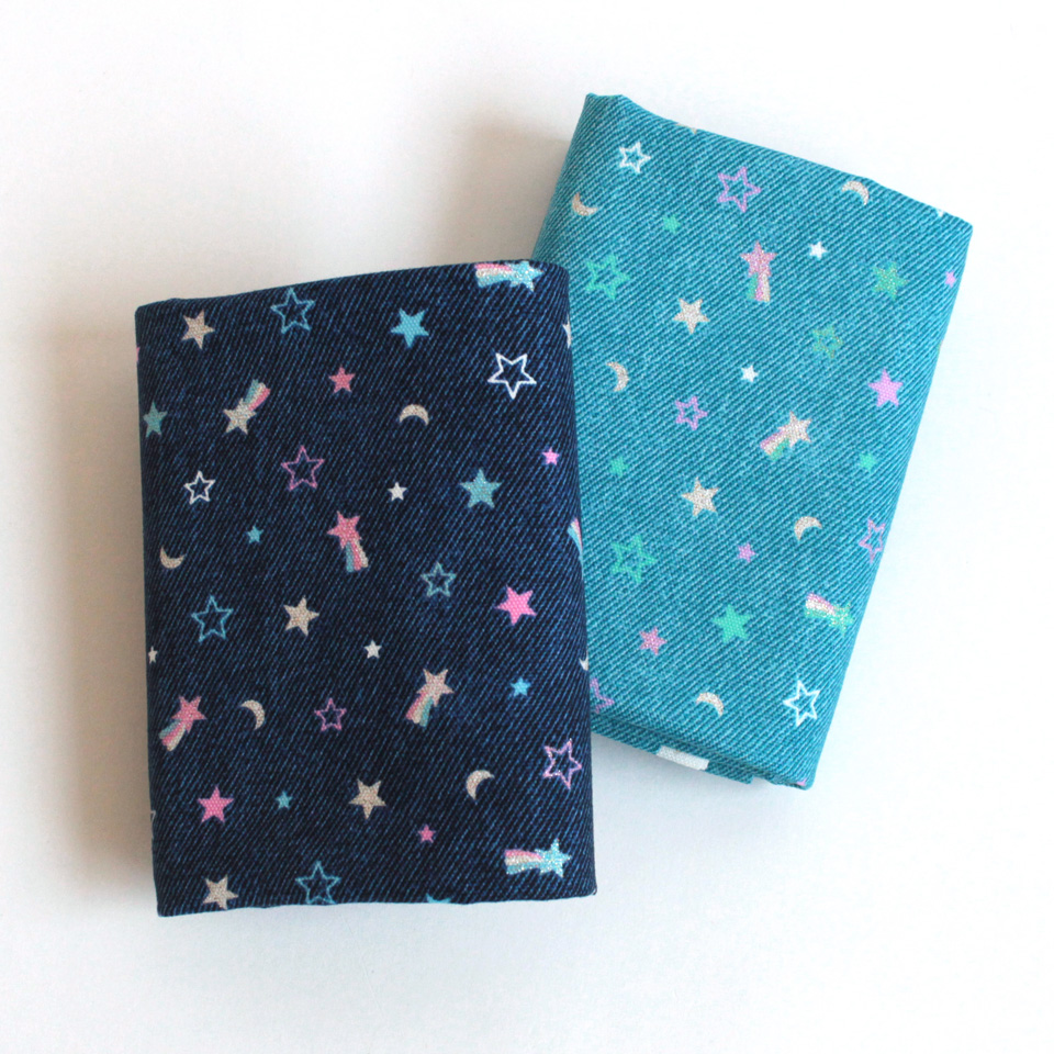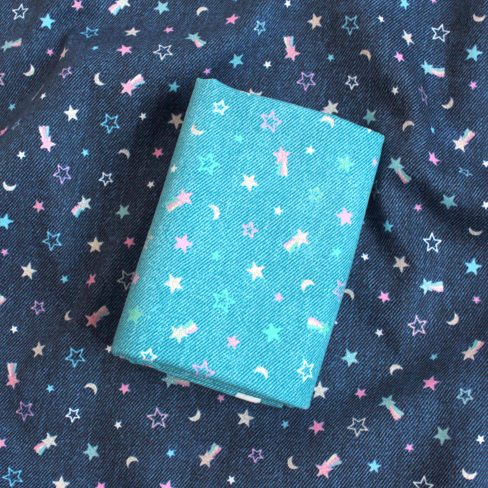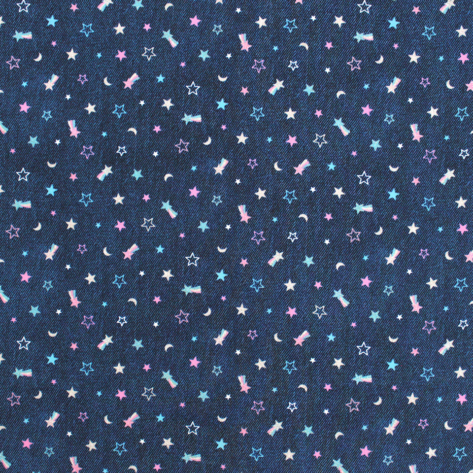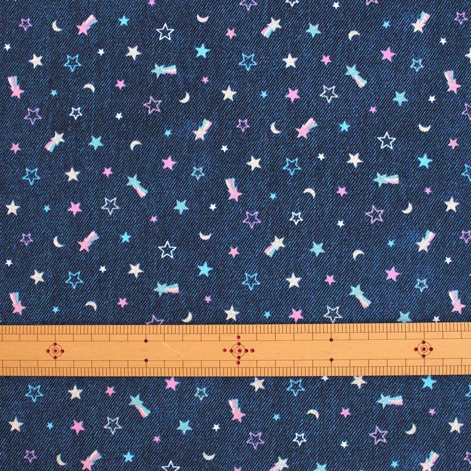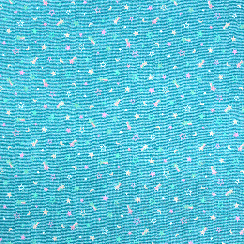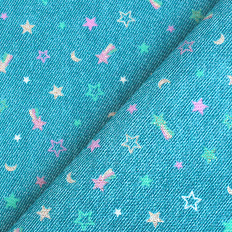 デニム風生地にラメ加工を施したスターモチーフをプリント。