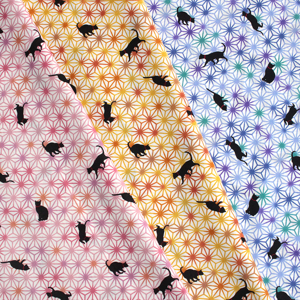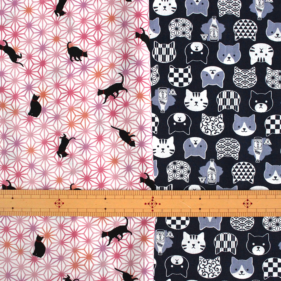 麻の葉模様に猫のシルエットを描いた柄と、猫ちゃんフェイスにところどころ市松模様を混ぜた柄の2デザイン。