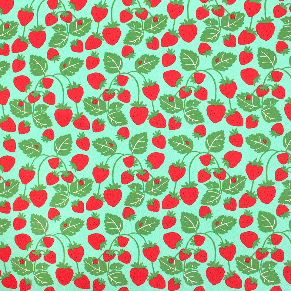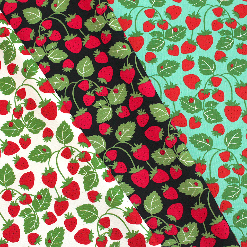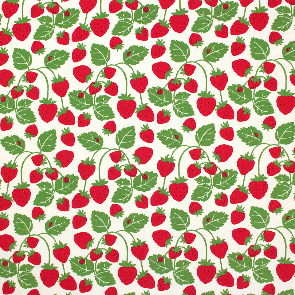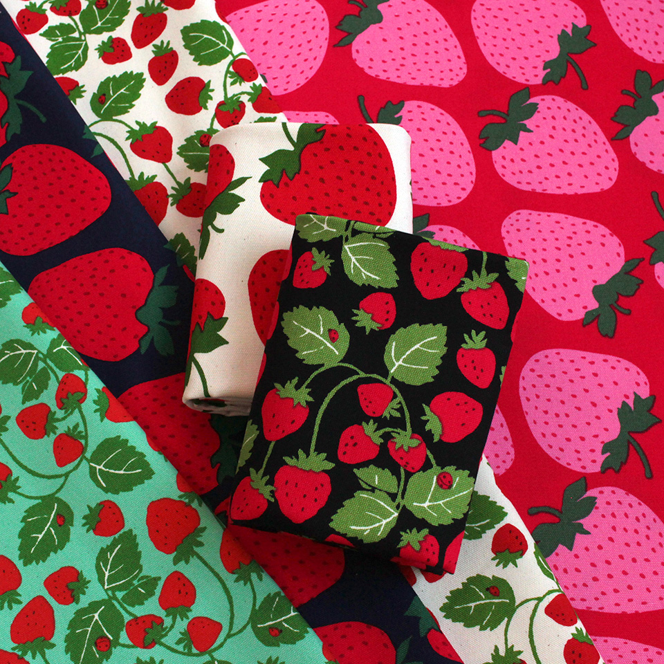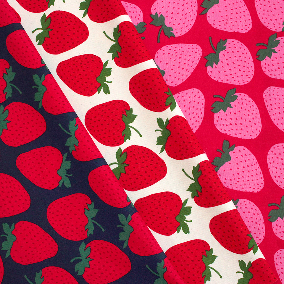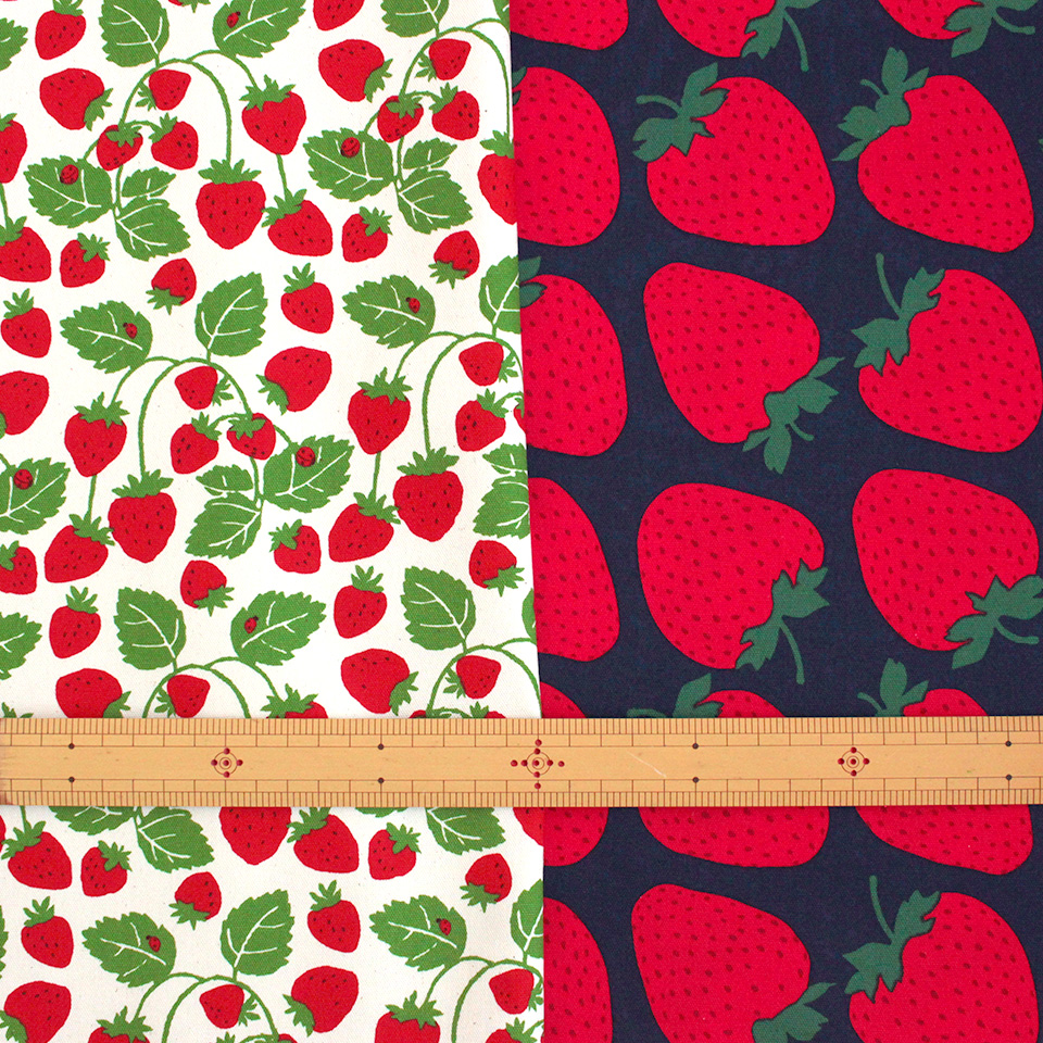 大粒いちごをシンプルに並べた「いちごビッグ」柄、葉っぱまで描いたナチュラルな「いちご畑」柄の2デザイン。