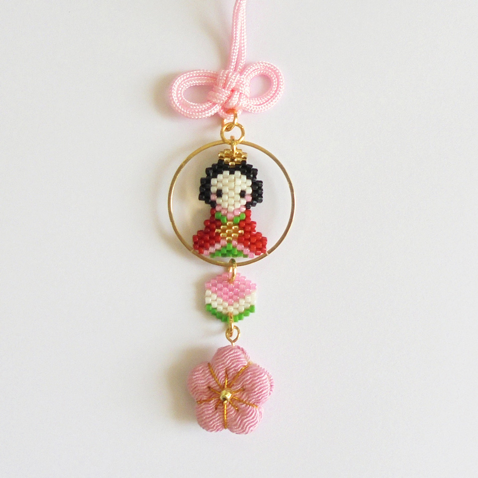 リングパーツの中にかわいらしい小さなおひなさま、おだいりさまが納まったつるし飾りです。
