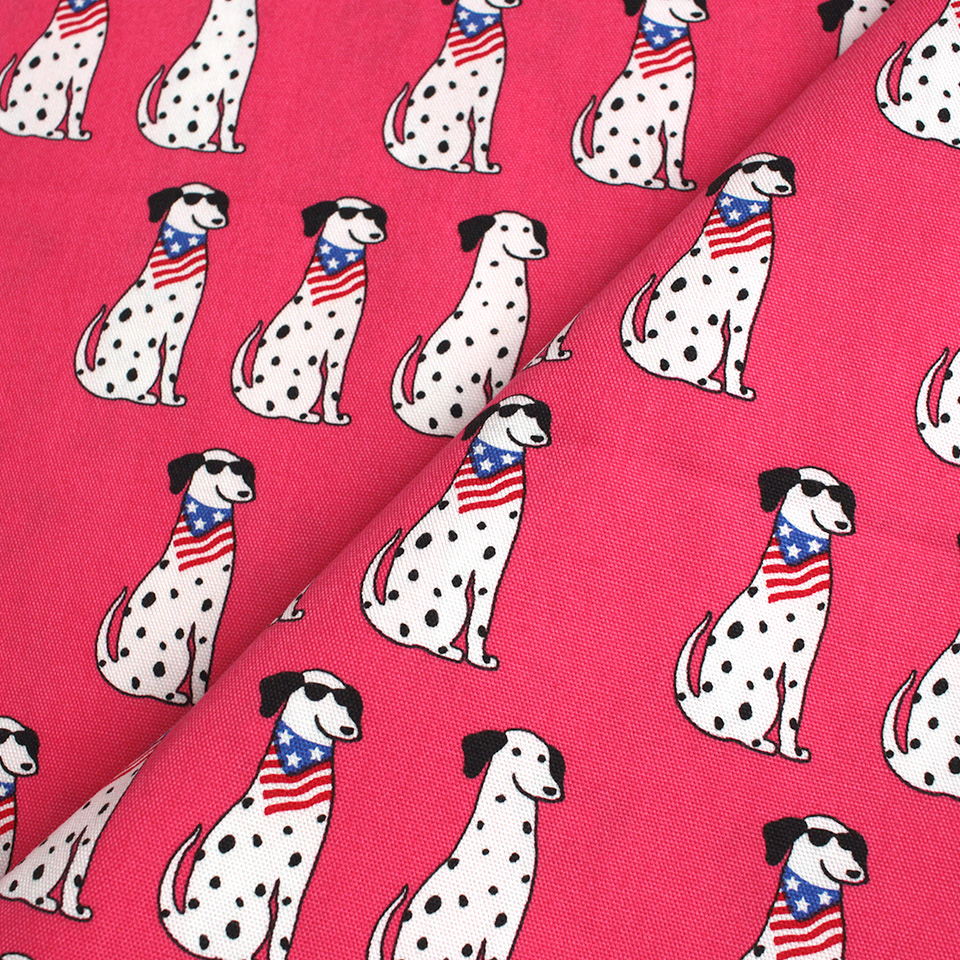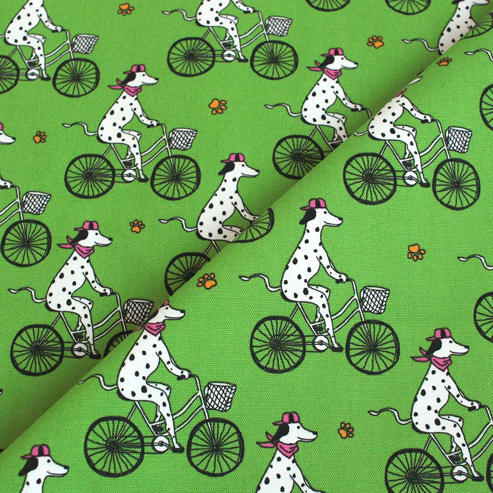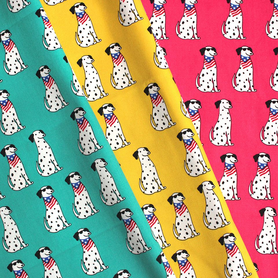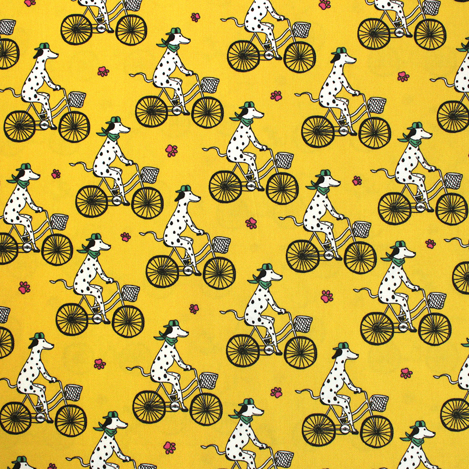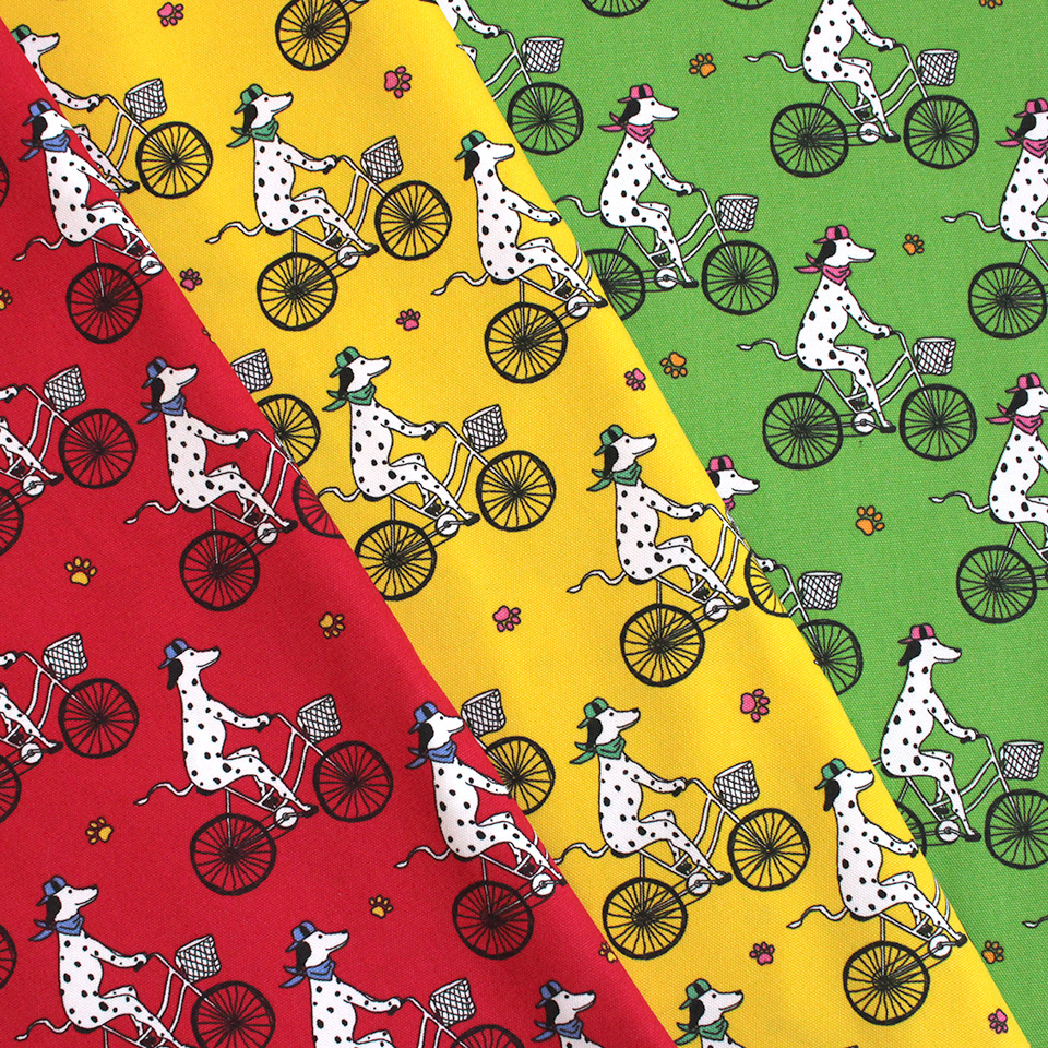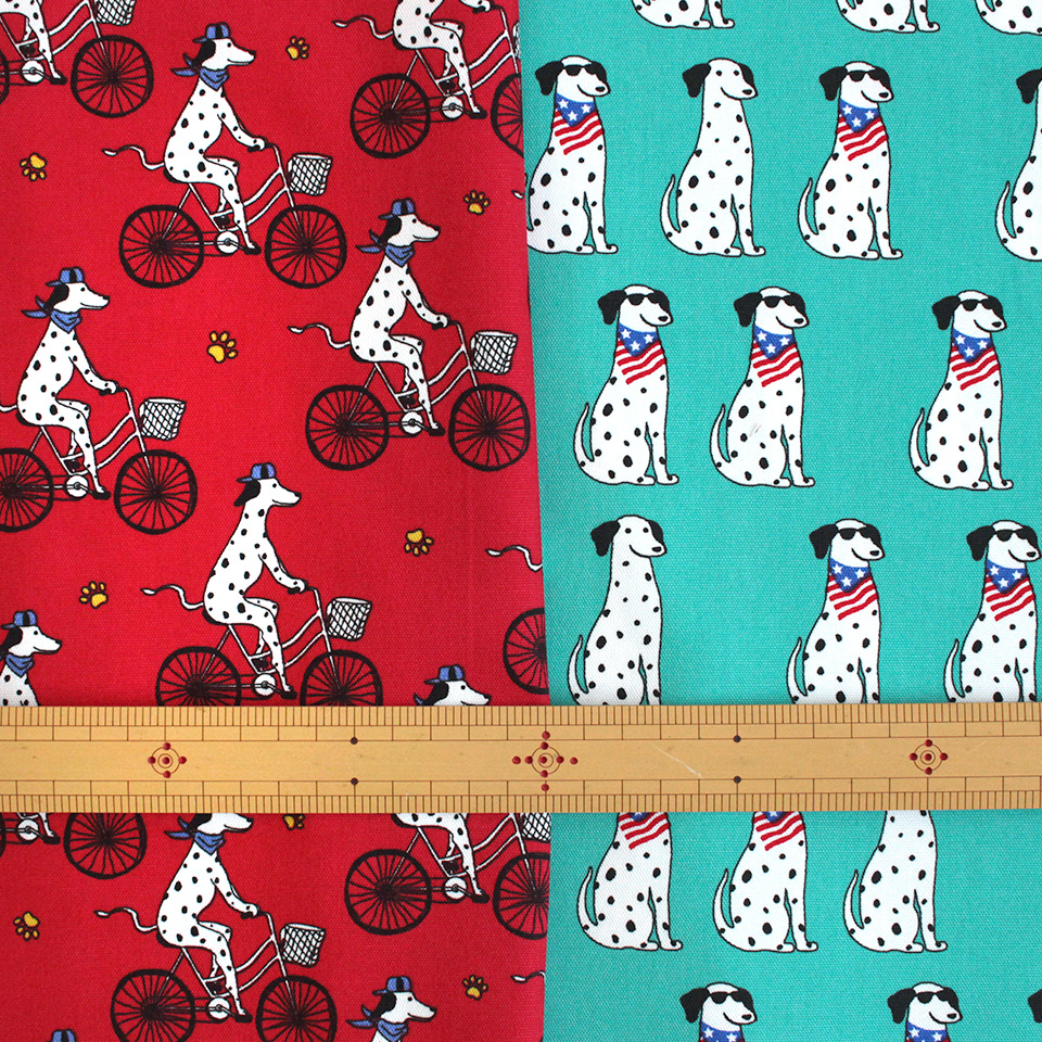 白地に黒のブチ模様がキュートな犬種・ダルメシアンをポップに描いた生地です。