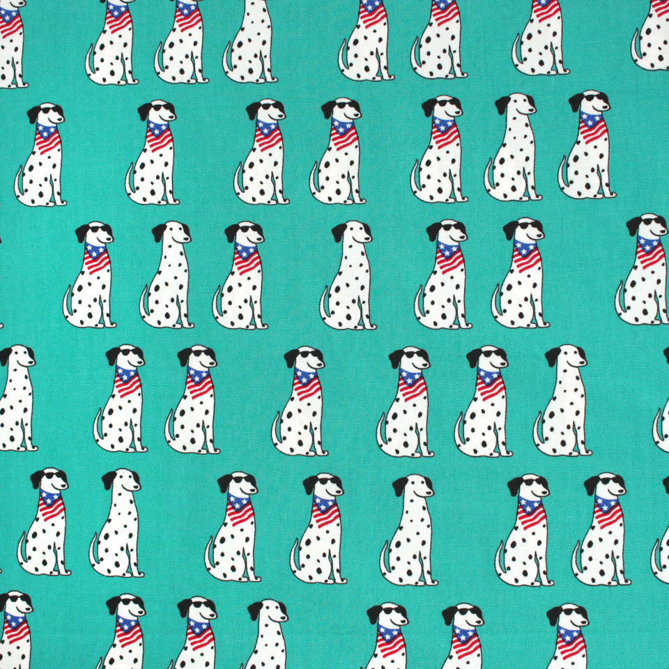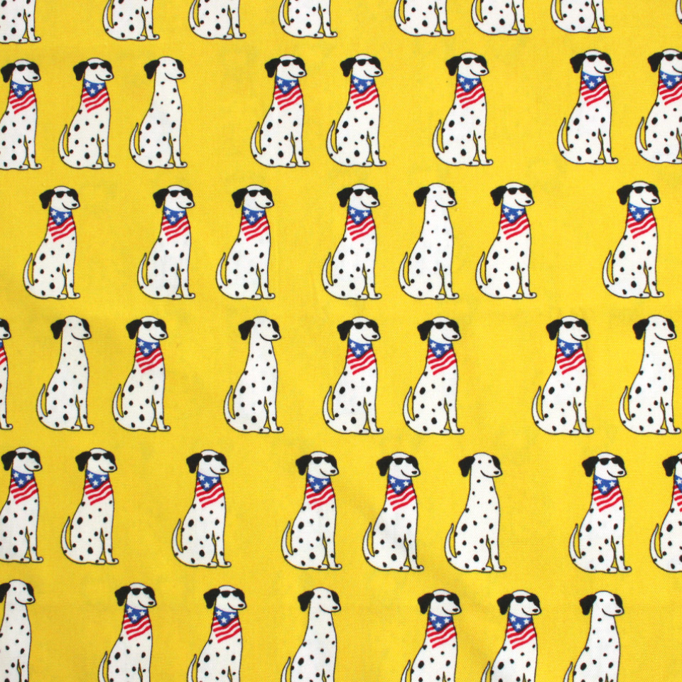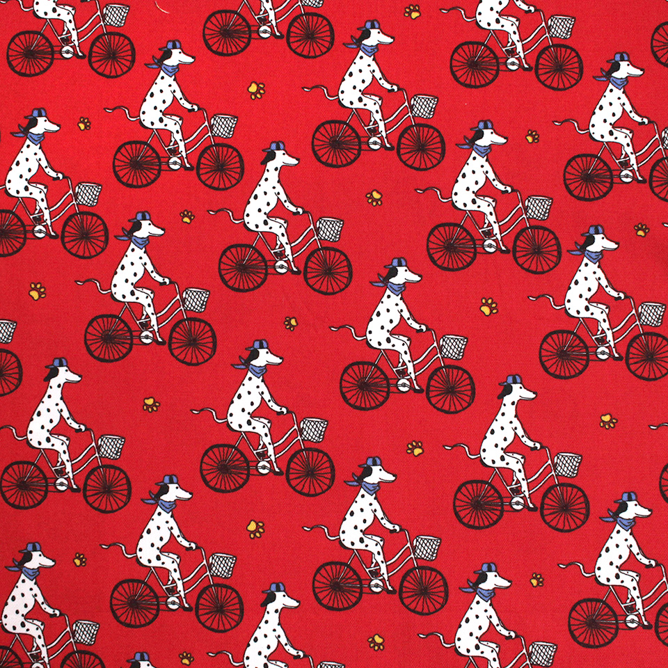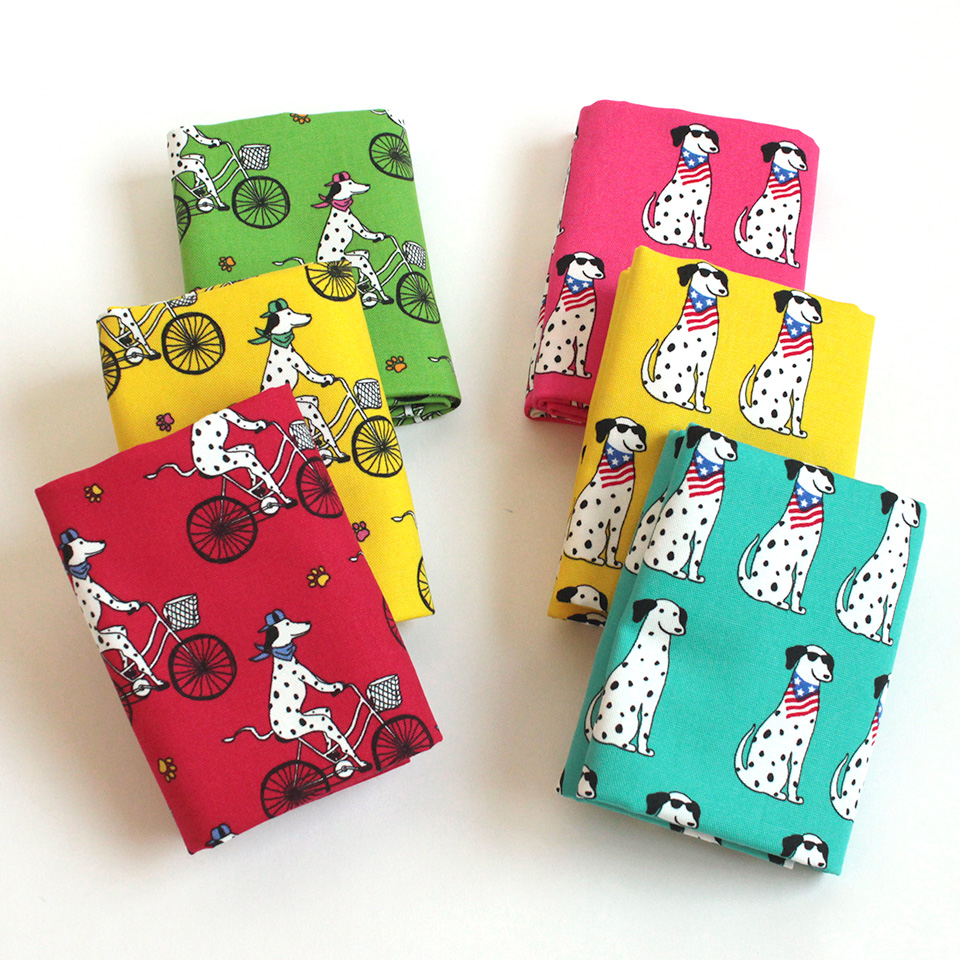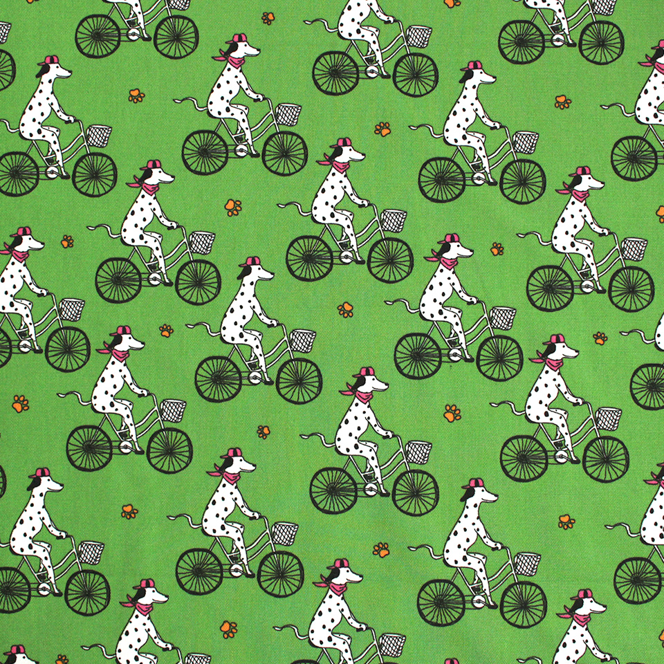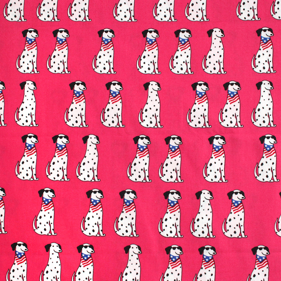 白地に黒のブチ模様がキュートな犬種・ダルメシアンをポップに描いた生地です。