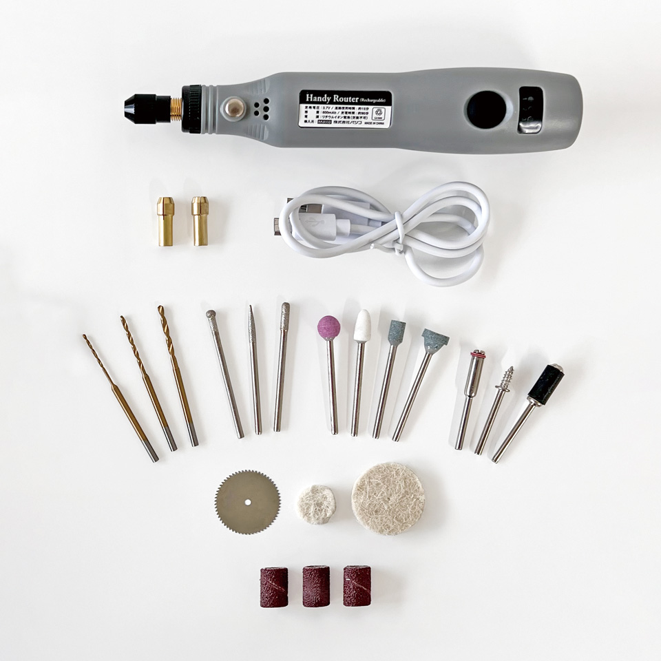 数種類のビットを付け替えることで、プラスチックや木、ガラスなど様々な素材の加工ができます。