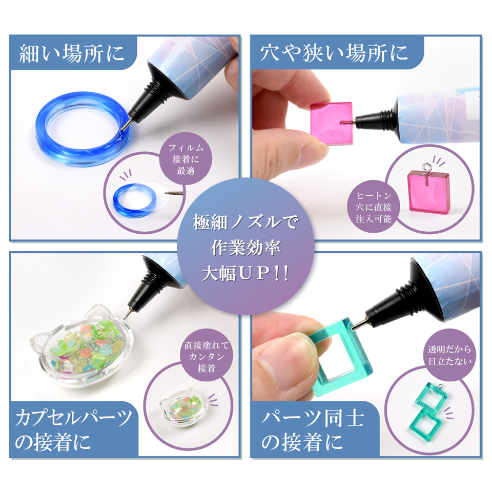 シャカシャカチャームのフィルム接着や、ヒートン穴に直接注入にもおすすめ。