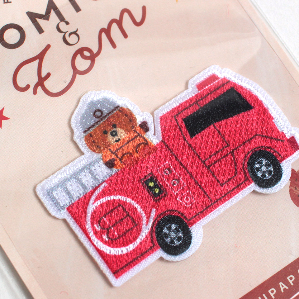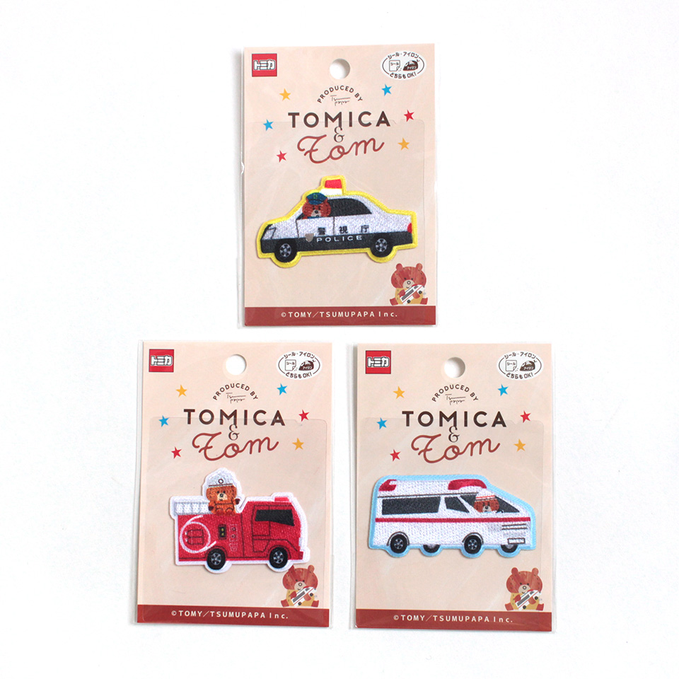 ほっこりしたトミカの物語を表現した刺しゅうタイプのワッペンです。