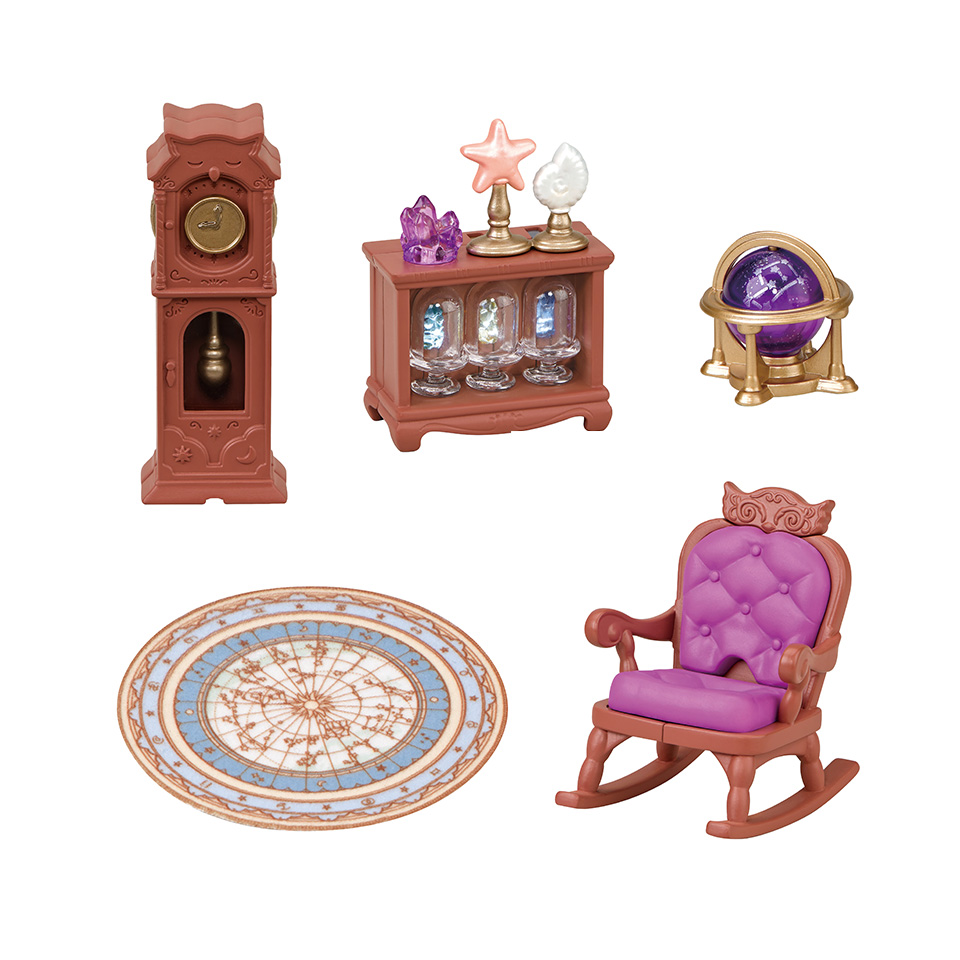 ロッキングチェアと時計、標本棚、天球儀、星のマットが付いています。