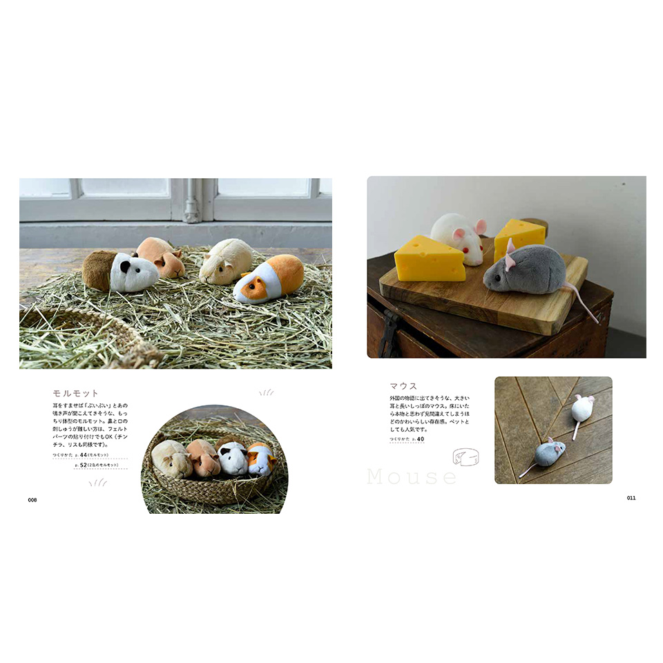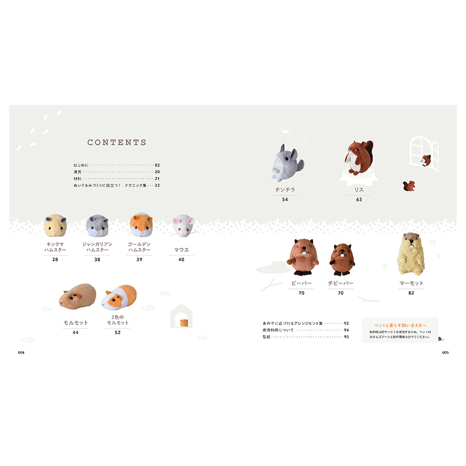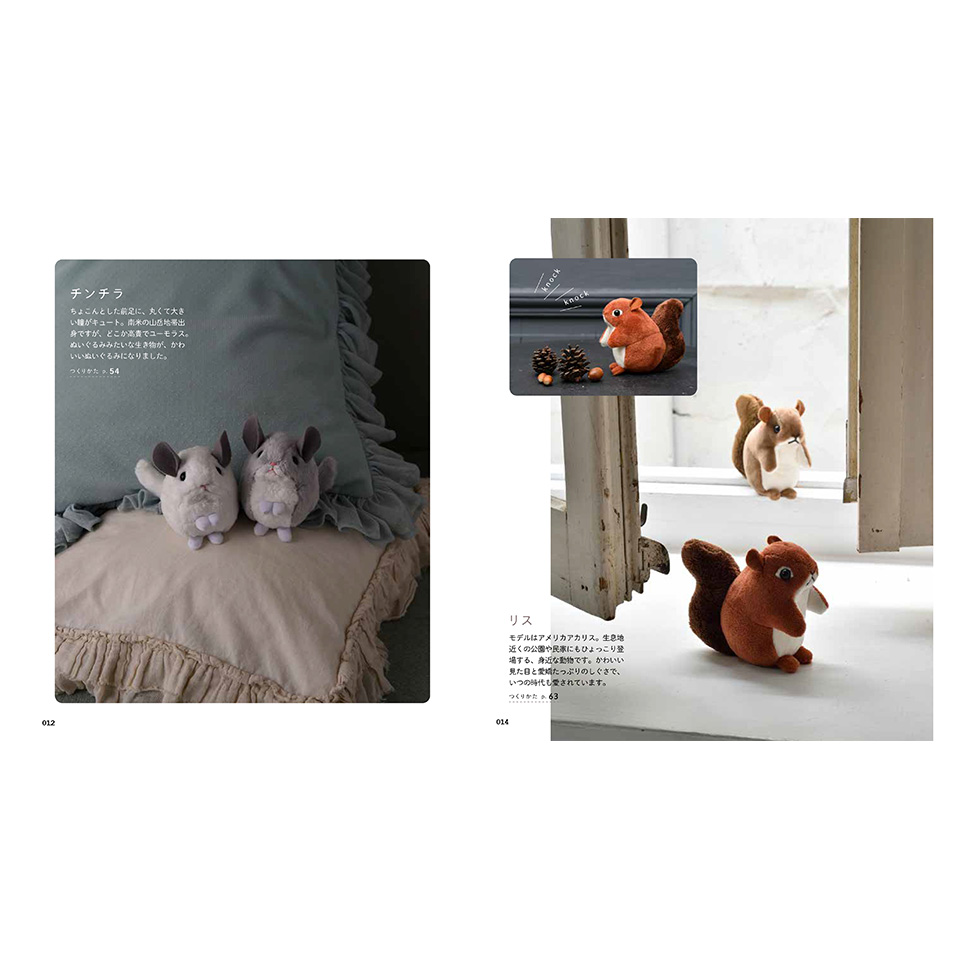 シンプルで簡単なハムスター、モルモットから、かわいいリス、チンチラ、存在感バツグンのマーモットまで、全11体の作り方を掲載。