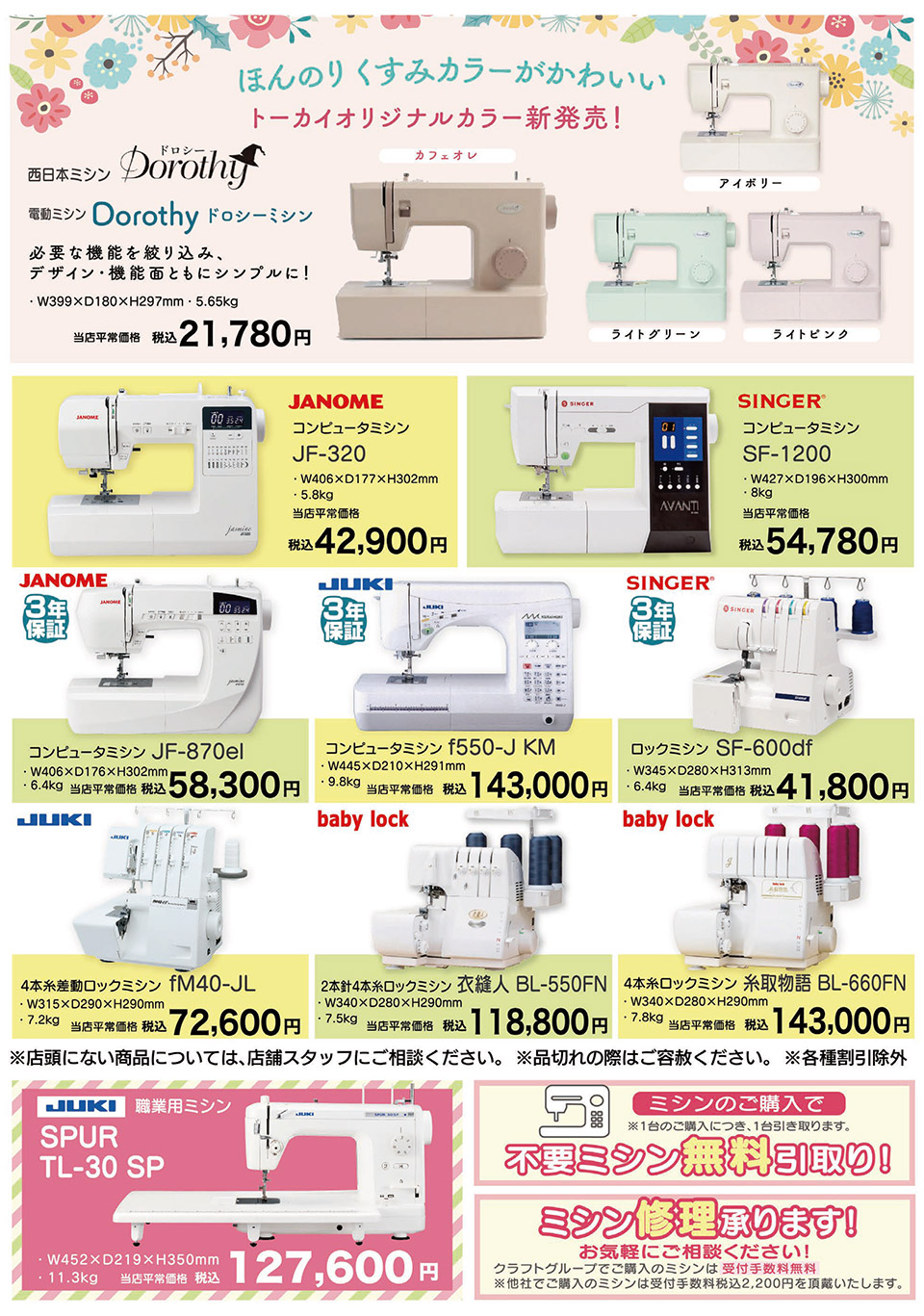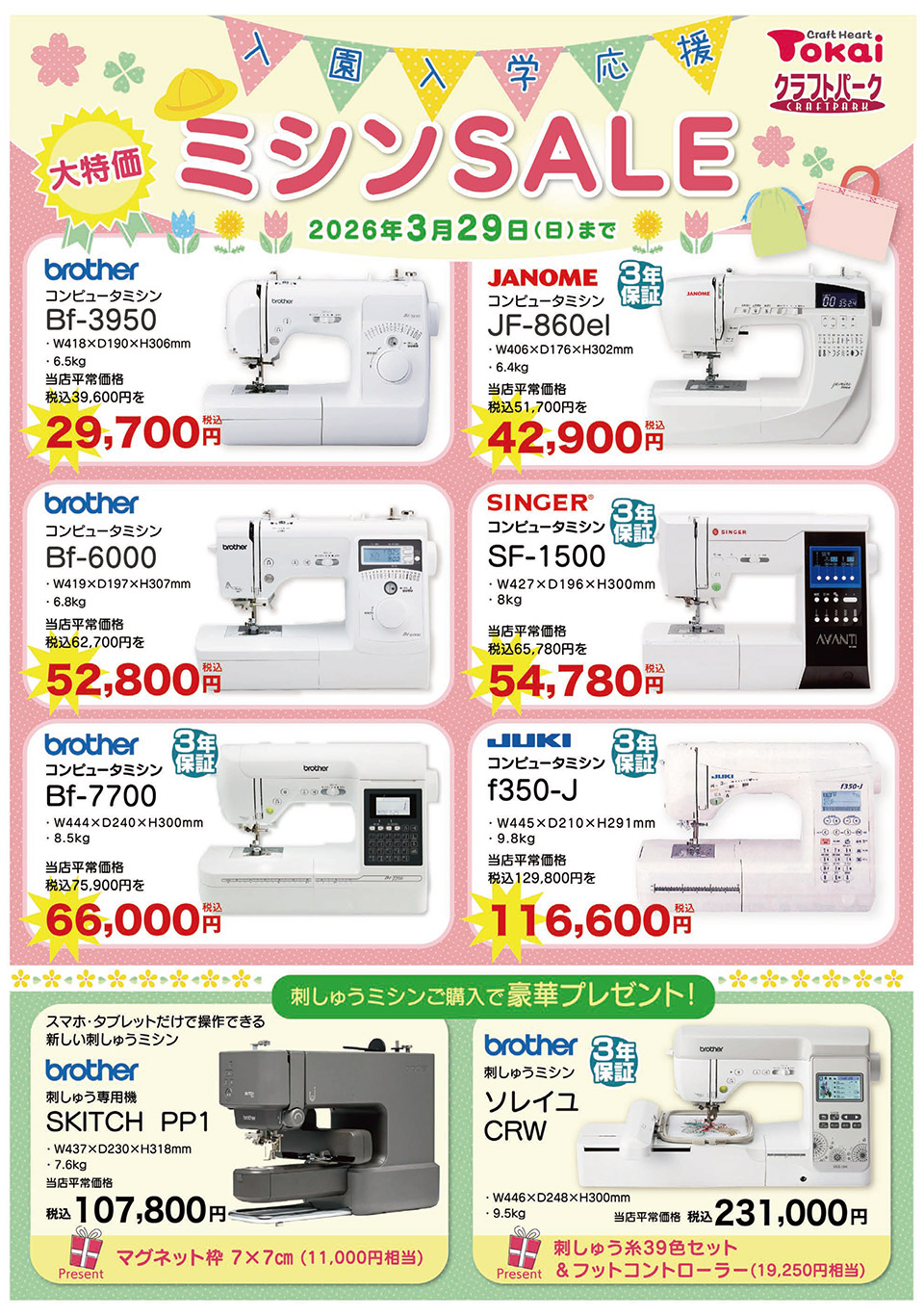 「入園入学グッズを作るためにミシンを購入したい」「そろそろミシン買い替え時かも…」とお考えの方へ、全国のクラフトグループ店舗にて、ミシンセールを開催中です。