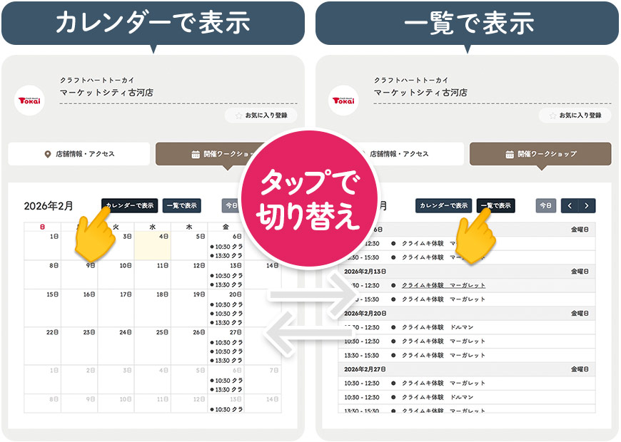 参加希望店舗の「開催ワークショップ」タブをタップするとカレンダーの画面に移ります。