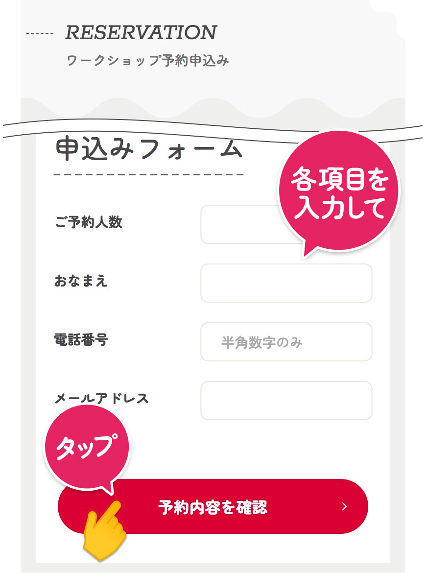予約申し込みページに飛びます。ワークショップ(レッスン)内容に間違いがないかを確認の上、ページ下部の申し込みフォームをすべてご入力ください。