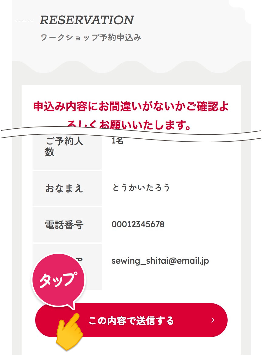申し込み内容を確認し、【この内容で送信する】をタップして申し込み完了です。
