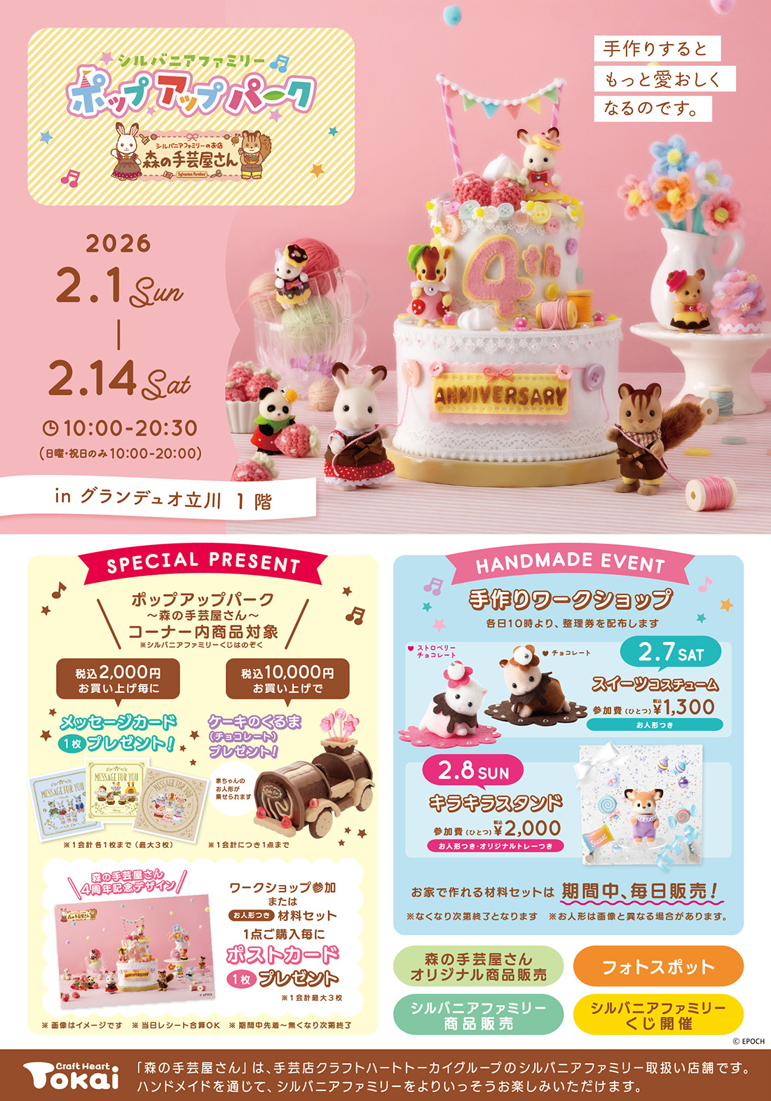 ハンドメイド×シルバニアファミリーのお店「森の手芸屋さん」のポップアップパーク~バレンタインスペシャル~が、東京都・JR立川駅直結「グランデュオ立川(外部サイト)」にて開催!